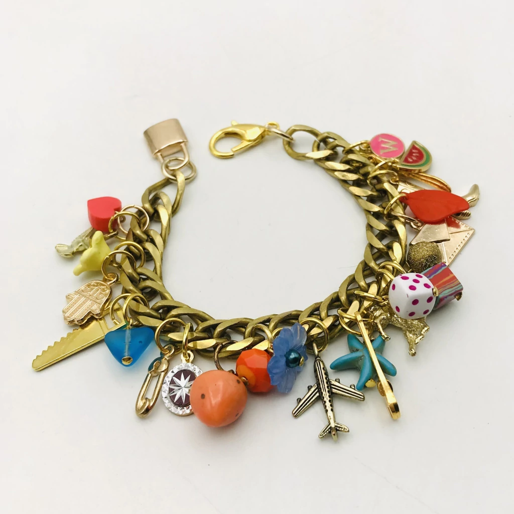 Pulsera de amuletos vintage, dijes en cristal, cerámica, vidrio, resina, botones, plomo, etc.